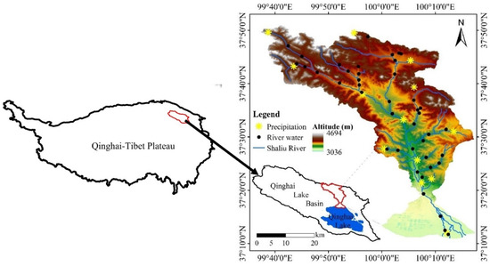 The area of the Shaliu River basin (37°10′55.92″–37°51′2.16″ N, 99°37′10.20″–100°17′9.96″ E) is 1679.2 km2, located in the north of Qinghai Lake in northeastern QTP (Figure 1). The altitude is between 3036 m and 4696 m [11]. The temperature in the Shaliu River basin has obvious seasonal changes, and the annual range is relatively large. The average temperature in January was −22.1–14.0 °C; the average temperature in July was 10.0–11.5 °C, the annual average temperature was −0.13 °C. The annual precipitation in the basin was between 300 mm and 600 mm, the precipitation was mainly concentrated in May to September. The annual average precipitation was 389.66 mm.