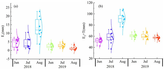 Temporal variation in soil fractionation values (E1) (a) and incomplete evaporation values (E2 + T) (b) in the summer of 2018 and 2019.