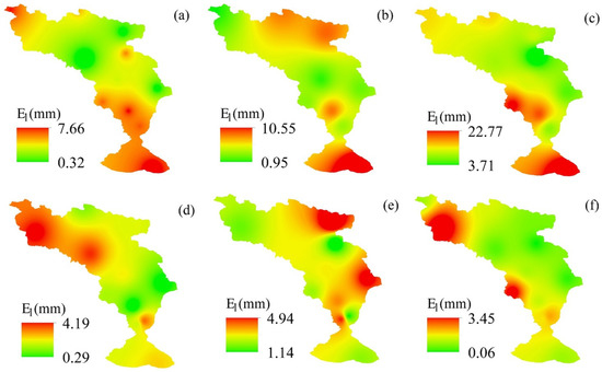 In terms of monthly variations, the ratio of E1 in June to August 2018 in the Shaliu River basin was 0.36% to 12.34%, 1.34% to 22.72%, and 3.32% to 22.87%, respectively. The average ratio of E1 was 6.83%, 7.72%, and 12.57%, respectively (Figure 9a). The variation of the average E1 ratio in the summer of 2018 showed a trend of first decreasing and then increasing. The maximum average E1 ratio was in August and the minimum value was in July (Figure 9a). In terms of spatial variation, the high-value areas of E1 ratio were mainly distributed in the southern part of the basin (Figure 10a–c). In June to August 2019, E1 ratio in the Shaliu River basin was 0.72% to 9.81%, 3.13% to 14.01%, and 0.17% to 11.57%, respectively. The average ratio of E1 was 5.82%, 8.26%, and 3.87%, respectively (Figure 9a). The variation of the average E1 value in the summer of 2019 showed a trend of increasing. The maximum average E1 value was in August and the minimum value was in June (Figure 9a). In terms of spatial variation, the high-ratio areas of E1 were mainly distributed in the northwestern and northeastern part of the basin (Figure 10d–f). There were certain differences in the monthly and spatial variations of E1 in the Shaliu River basin in the summer of 2019, indicating that the E1 in the basin has regional differences.