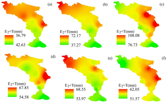 In terms of monthly variations, E2 + T, in June to August 2018 in the Shaliu River basin was 42.63 mm to 56.79 mm, 37.27 mm to 72.17 mm, and 76.73 mm to 108.08 mm, respectively. The average value of E2 + T was 51.99 mm, 57.10 mm, and 92.47 mm, respectively (Figure 2b). The variation of the average E2 + T value in the summer of 2018 showed an increasing trend. The maximum average E2 + T value was in August and the minimum value was in June (Figure 2b). In terms of spatial variation, the high-value areas of E2 + T were mainly distributed in the northern part of the basin, indicating that the E2 + T was stronger in the northern part of the basin (Figure 4a–c). In June to August 2019, E2 + T in the Shaliu River basin was 54.58 mm to 67.85 mm, 53.97 mm to 68.55 mm, and 51.57 mm to 62.05 mm, respectively. The average value of E2 + T was 61.02 mm, 60.32 mm, and 57.32 mm, respectively (Figure 2b). The variation of the average E2 + T value in the summer of 2019 showed a decreasing trend. The maximum average E2 + T value was in June and the minimum value was in August (Figure 2b). In terms of spatial variation, the high-value areas of E2 + T were mainly distributed in the central part of the basin, indicating that the E2 + T was stronger in that part of the basin (Figure 4d–f). There were certain differences in the monthly and spatial variations of E2 + T in the Shaliu River basin in the summer of 2019.