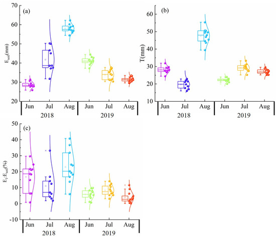 Temporal changes in soil evaporation (Esoil) (a) and plant transpiration (T) (b) values and the proportion soil fractionation in soil evaporation (E1:Esoil) (c) in summers of 2018 and 2019.