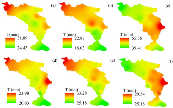 In terms of monthly variations, T, in June to August 2018 in the Shaliu River basin, was 24.43 mm to 31.89 mm, 16.03 mm to 22.87 mm, and 39.41 mm to 55.36 mm, respectively. The average value of T was 28.16 mm, 19.66 mm, and 47.60 mm, respectively (Figure 5b). The variation of the average T value in the summer of 2018 showed a trend of first decreasing and then increasing. The maximum average T value was in August and the minimum value was in July (Figure 5b). In terms of spatial variation, the high-value areas of T were mainly distributed in the northern and central part of the basin, indicating that T was stronger in that part of the basin (Figure 7a–c). In June to August 2019, T in the Shaliu River basin was 20.03 mm to 23.98 mm, 25.18 mm to 33.28 mm, and 25.18 mm to 29.54 mm, respectively. The average value of T was 22.31 mm, 29.22 mm, and 27.08 mm, respectively (Figure 5b). The variation of the average T value in the summer of 2019 showed a trend of first increasing and then decreasing. The maximum average T value was in July and the minimum value was in June (Figure 5b). In terms of spatial variation, the high-value areas of T were mainly distributed in the central and northern part of the basin, indicating that T was stronger in the that part of the basin (Figure 7d–f). There were certain differences in the monthly and spatial variations of T in the Shaliu River basin in the summer of 2019.
