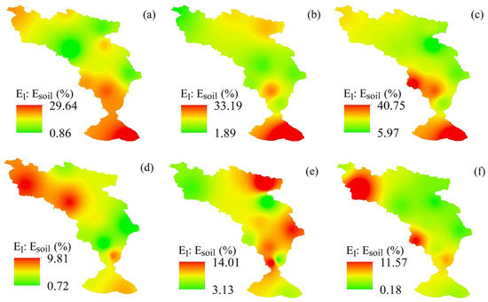 Spatial variation of the proportion of soil fractionation in soil evaporation (E1:Esoil) in summer 2018 (a–c) and 2019 (d–f).
