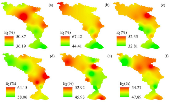 In terms of monthly variations, the ratio of E2 in June to August 2018 in the Shaliu River basin was 36.19% to 50.87%, 44.41% to 67.42%, and 32.81% to 52.35%, respectively. The average ratio of E2 was 41.98%, 60.38%, and 42.41%, respectively (Figure 9b). The variation of the average E2 ratio in the summer of 2018 showed a trend of first increasing and then decreasing. The maximum average E2 ratio was in July and the minimum value was in June (Figure 9b). In terms of spatial variation, the high-value areas of E2 were mainly distributed in the northern part of the basin (Figure 11a–c). In June to August 2019, E2 ratio in the Shaliu River basin was 58.06% to 64.15%, 45.93% to 52.92%, and 47.89% to 54.27%, respectively. The average ratio of E2 was 61.04%, 49.24%, and 51.66%, respectively (Figure 9b). The variation of the average E2 value in the summer of 2019 showed a trend of first decreasing and then increasing. The maximum average E2 ratio was in June and the minimum value was in July (Figure 9b). In terms of spatial variation, the high-ratio areas of E2 were mainly distributed in the northern and central part of the basin (Figure 11d–f). There were certain differences in the monthly and spatial variations of E2 ratio in the Shaliu River basin in the summer of 2019, indicating that the E2 ratio in the basin has regional differences.