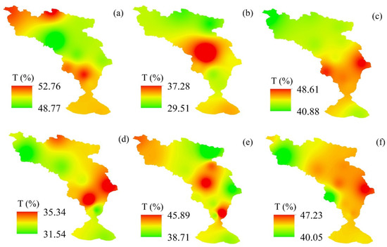 In terms of monthly variations, the ratio of T in June to August 2018 in the Shaliu River basin was 48.77% to 52.79%, 29.51% to 37.28%, and 40.88% to 48.61%, respectively. The average ratio of T was 51.18%, 31.89%, and 45.01%, respectively (Figure 9c). The variation of the average T ratio in the summer of 2018 showed a trend of first decreasing and then increasing. The maximum average T ratio was in August and the minimum ratio was in July (Figure 9c). In terms of spatial variation, the high-ratio areas of T were mainly distributed in the northern and central part of the basin (Figure 12a–c). In June to August 2019, T ratio in the Shaliu River basin was 31.54% to 35.34%, 38.71% to 45.89%, and 40.05% to 47.23%, respectively. The average ratio of T was 33.14%, 42.5%, and 44.47%, respectively (Figure 9b). The variation of the average T ratio in the summer of 2019 showed a trend of first increasing and then decreasing. The maximum average T ratio was in July and the minimum value was in June (Figure 9b). In terms of spatial variation, the high- ratio areas of T were mainly distributed in the northern and central part of the basin (Figure 12d–f). There were certain differences in the monthly and spatial variations of T in the Shaliu River basin in the summer of 2019, indicating that the T ratio in the basin has regional differences.