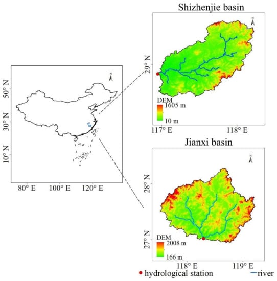 Two basins with different areas are selected to test the generality of the results, namely the Jianxi basin and Shizhenjie basin in southeast China. The Jianxi basin is approximately twice the size of the Shizhenjie basin. The Jianxi River basin (26°31′–28°31′ N, 117°31′–119°00′ W) is the largest tributary in the upper reaches of the Minjiang River, with a drainage area of 14,898 km2 above the Qilijie station. Qilijie station is located at the outlet of Jianxi River. The elevation of the Jianxi basin ranges from 166 m to 2008 m (a.m.s.l.). The Lean River has a drainage area of 8294 km2 above Shizhenjie station. Shizhenjie station is located downstream of Lean River. In the Shizhenjie basin (28°56′–29°58′ N, 116°94′–118°23′ W), the elevation ranges from 10 m to 1605 m (a.m.s.l.). The drainage net and terrain of our two study areas are shown in Figure 1.