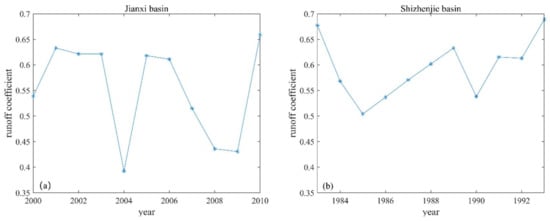 The change in the runoff coefficient of Jianxi basin (a) and Shizhenjie basin (b).