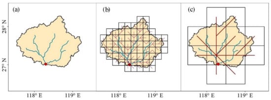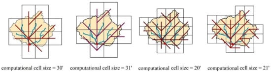 Following the boundary of the study basin, computational cells for routing methods are generated. The computational cell sizes range from 5 arc-min to 60 arc-min with an interval of 1 arc-min, resulting in a total of 56 cell sizes. For illustration purposes, the computational cells of Jianxi basin at the resolution of 10′ and 30′ are shown in Figure 3. The computational cell is constructed according to the following principle: the leftmost longitude of the cells is the same as the integer part of the leftmost latitude of the basin boundary and the bottom latitude of the cell is the same as the integer part of the bottom latitude of the watershed boundary. To maintain the water balance, the area of each cell is the area of the basin belonging to this cell. It can avoid the area errors for the boundary cells []. After generating the computational cells, extract the flow net at the same resolution of computational cell size using the network scaling algorithm (NSA) [] (Figure 3).