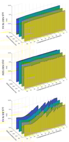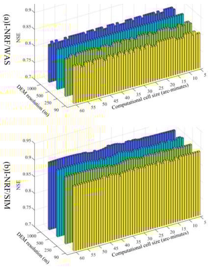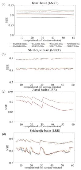Figure 4, Figure 5 and Figure 6 show that the discharge simulation performance curve for the Jianxi basin, as computational cell size changes, is mostly a straight line. While the WASMOD model generates some noise in the NSE values of the Shizhenjie basin (Figure 5a,b and Figure 6b), the NSE values are mostly constant, despite the changing computational cell sizes. In general, the discharge simulation performance with the I-NRF routing method stays stable, regardless of the computational cell size. Gong et al. [] discussed in detail why NRF discharge simulation performance is scale-independent. I-NRF, the improved version of NRF, retains the scale-independency characteristic of NRF. This scale-independency is produced by the algorithm, in which the discharge simulation performance is obtained by the convolution of the runoff generation result and the cell response function (CRF). The CRF is aggregated from the pixel response function (PRF), which is determined by the slope and the routing length extracted from the DEM grid when the wave velocity is fixed. Besides, there is no loss of information in the process of converting the PRFs to CRFs. Thus, the CRFs contain all the information from the PRFs and the DEM. As long as the DEM resolution stays the same, this algorithm generates stable results that are insensitive to the changes of computational cell size.