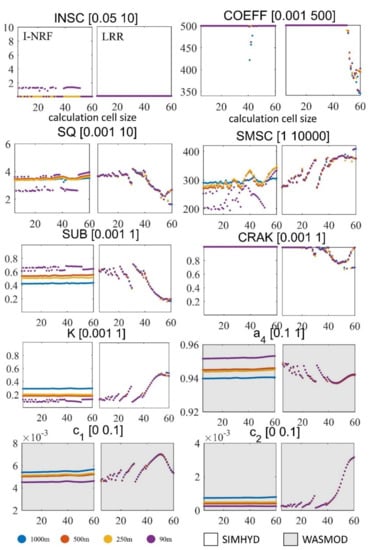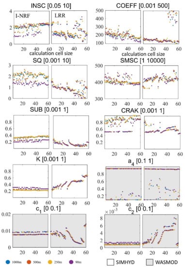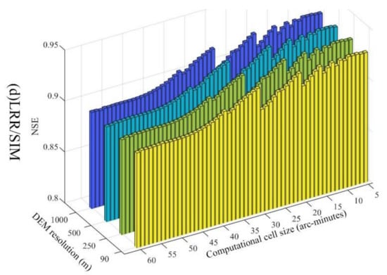 The results for the Shizhenjie basin are shown in Figure 13. Just as they did in the Jianxi basin, the optimal runoff generation parameters with the I-NRF routing method vary with the DEM resolutions. The runoff generation parameters with the I-NRF routing method vary much more widely with the computational cell size in the Shizhenjie basin than they do in the Jianxi basin. Besides, the runoff generation parameters with the LRR routing method vary much more widely with the DEM resolutions in the Shizhenjie basin than they do in the Jianxi basin. With the LRR routing method, the parameters  and SUB follow the same NSE trends, while parameters K and  exhibit opposing NSE trends as computational cell size changes in the Shizhenjie basin (Figure 13 and Figure 6d).
