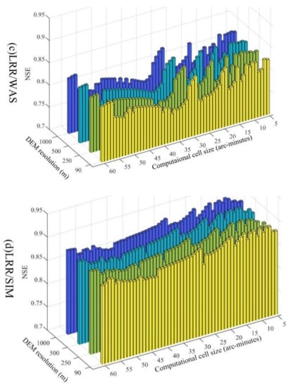 Three-dimensional histogram of NSE under the cross combination of 4 DEM resolutions (x-axis) and 56 computational cell sizes (y-axis) in Shizhenjie basin. There are four hydrological models: the model composed of I-NRF and WASMOD (a); the model composed of I-NRF and SIMHYD (b); the model composed of LRR and WASMOD (c); the model composed of LRR and SIMHYD (d).