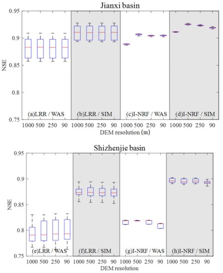 Box plots of NSE value variations with the computational cell size and the DEM resolution are shown in Figure 8. The impact of the DEM resolution on the discharge simulation performance is slightly larger for the I-NRF routing method than it is for the LRR routing method. For the I-NRF routing method, the use of different DEM resolutions leads to some differences in modelling performance, for both runoff generation models and for both study basins; from these observations, it can be inferred that the DEM resolution directly affects the NSE values, to some extent (Figure 8c,d,g,h). For the LRR routing method, the average NSE for all computational cell sizes is similar when DEM resolution changes, regardless of the runoff generation model or the study basin. As such, it can be concluded that the DEM resolution has little effect on the overall LRR discharge simulation performance (Figure 8a,b,e,f). The laws analyzed from changes in PBIAS are the same as those analyzed from changes in NSE.