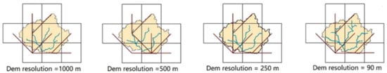 The DEM with the resolution of 1000 m is obtained from https://www.usgs.gov/centres/eros/science/usgs-eros-archive-digital-elevation-hydro1k?qt-science_centre_objects=0#qt-science_centre_objects (accessed on 14 January 2022). The DEM with the resolution of 500 m, 250 m and 90 m are all available at http://www.resdc.cn/data.aspx?DATAID=123 (accessed on 14 January 2022). The discharge data used in this study are not provided due to the confidentiality of the data. The daily precipitation, air temperature, and relative humidity data are available at http://data.cma.cn/ (accessed on 14 January 2022).