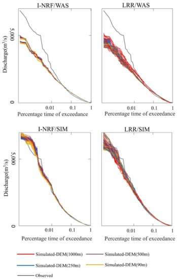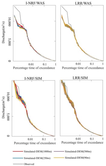 - The effects of the computational cell size and the DEM resolution on the simulated discharge accuracy are mainly reflected in the high-flow range. In this study, the performance of SIMHYD is better than that of WASMOD in the high-flow range, when they are combined with both routing methods.