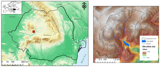 Lake Ighiel is a karst lake located in the Apuseni Mountains (Romania) at 924 m above sea level (Figure 1). It has a small catchment area that comprises Jurassic limestones, but the southern inflow to the lake drains an area of Mesozoic molasse and volcanic rocks (diabase). Over time, changes in vegetation cover and the development of erosional features have occurred within the catchment; a detailed description is provided in References [5,41].