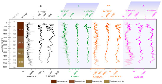 The Fe pattern depicted by all three methods is similar; low values (FeXRF-CS < 40,000 peak area, FeFPXRF < 30,000 µg g−1, FeICP-OES < 25,000 ppm) characterise the interval below 400 cm depth (Unit I). An increasing trend is visible between 400 cm and 150 cm (Unit III-II), followed by rapid changes between 150 cm and 0 cm depth (Unit IV) (Figure 3). FeXRF-CS also varies, and subtle shifts are evident in the non-averaged, high-resolution results (Figure 3).