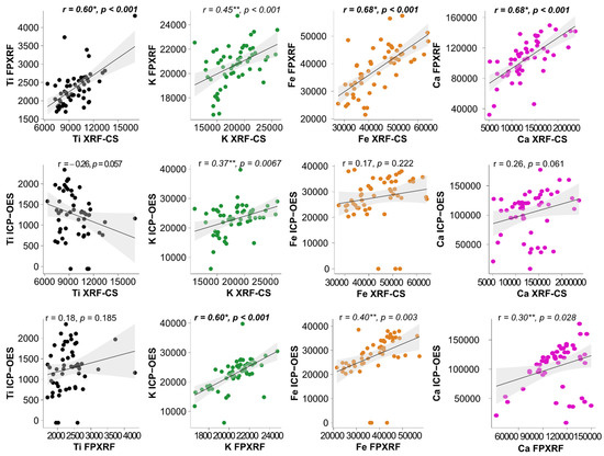 The Pearson correlation coefficient (r) for the raw dataset shows strong correlations between XRF-CS and FPXRF for Ti (r = 0.60, p < 0.0001), Fe (r = 0.68, p < 0.0001) and Ca (r = 0.68, p < 0.0001) (Table 2; Figure 4) and a moderate correlation for K (r = 0.45, p < 0.0001). For most of the elements, XRF-CS displays moderate to low correlations with ICP-OES. FPXRF shows strong correlation with ICP-OES for K (r = 0.60, p < 0.0001), moderate correlations for Fe (r = 0.40, p < 0.003) and Ca (r = 0.30, p < 0.028) and a low correlation for Ti (r = 0.18, p < 0.185) (Table 2; Figure 4).