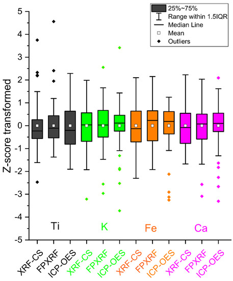 Overall, the boxplots (Figure 5) show that, for specific elements and methods, the data share the same stratigraphic pattern, varying across the same range of minimum and maximum values. However, some differences were observed for some methods for which median, extreme values and outliers are different. Across the methods, Ti shows median values, which are only slightly different, with TiXRF-CS and TiICP-OES sharing a similar median value. However, TiICP-OES display the greatest range of values. TiXRF-CS and TiFPXRF have negative and positive outliers with a wider distribution and scattered data. K analysed with XRF-CS shows a similar median value to K analysed with FPXRF, but KXRF-CS displays a greater range. KICP-OES is less dispersed, but outliers are present. FeXRF-CS shows widely scattered data, whereas FeXRF-CS and FeICP-OES share the same median values and only FeICP-OES shows outliers (Figure 5). CaXRF-CS displays widely scattered data, whereas CaXRF-CS and CaICP-OES have a similar median, but both show negative and positive outliers. More attention should be paid to elements and methods, e.g., TiICP-OES, FeICP-OES, CaICP-OES, for which the data show important outliers and a higher variability (larger boxes and longer whiskers), denoting scattered data. It is interesting that these elements are also the ones that do not mimic the trend of the raw data (Figure 3).