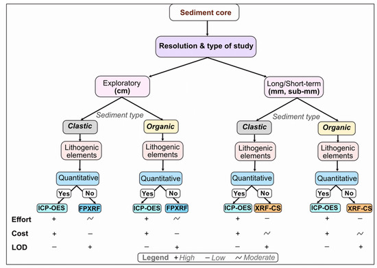 In the case study discussed here, the comparison of several analytical techniques that are concomitantly applied to karstic Lake Ighiel’s clayey sediments reveals that the method choice will impact the usefulness of the data and, therefore, proxy applicability and inference potential. Given the significant time and costs of laboratory analyses, our assessment highlights some important considerations in planning sediment geochemical analyses (Figure 6). Therefore, the use of XRF-CS is recommended in laminated sediments, as this instrument is capable of providing further insight into the nature of the laminations, while homogenous sediments could be analysed with lower-resolution instruments (FPXRF, ICP-OES).