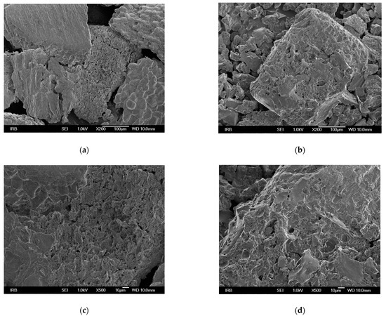 The morphological properties of the surface of the adsorbents were investigated using FESEM imaging. The rougher surface of MHS with more visible cavities compared to HS is shown in Figure 1. Similar results were reported by Yang et al. [37] who observed porous structure in the adsorbent functionalized with triethylamine groups, and by Keränen et al. [34] who used modified bark and peat for nitrate removal.