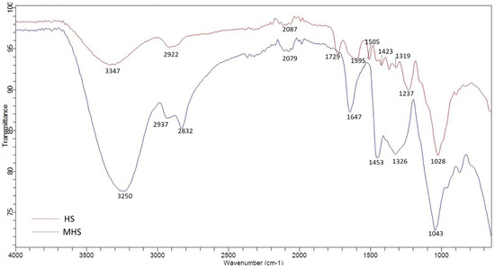 For the identification of the surface functional groups of HS and MHS, FTIR spectroscopy was applied and the respective spectra recorded (Figure 2). The broad band at 3250 cm−1 dominates the FTIR spectra of MHS and represents hydroxyl groups (-OH) [37]. The bands can be assigned to the O-H stretching vibrations caused by inter- and intramolecular hydrogen bonding of polymeric compounds (e.g., lignin and cellulose). The peak at 2937 cm−1 could be attributed to C-H stretching vibrations of -CH2, while the peak at 2832 cm−1 could be attributed to the same vibrations of -CH3 groups [38]. The peaks at 1647 cm−1 and 1453 cm−1 could be assigned to aromatic cyclic groups and quaternary ammonium groups [3,37], respectively. Similar results were also observed for other quaternized adsorbents [39,40].