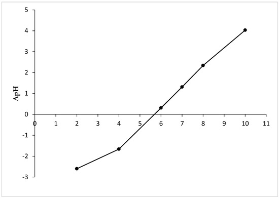 The point of zero charge was determined according to Khan and Sarwar [35]. Briefly, in a series of Erlenmeyer flasks (different for each pH of the solution), 0.5 g of MHS reacted with 20 mL of 0.01 M NaCl after adjusting the pH of the solutions (from 2 to 10) with NaOH or HCl. The flasks were shaken for 24 h at 25 °C and 130 rpm. Then, the solutions were filtered and the final pH was measured in each flask, and the difference between the initial and final pH (ΔpH) was calculated. The pHpzc value was determined from the ΔpH versus pHinitial plot.