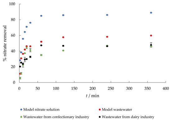 In addition to its high solubility in water, the nitrate ion is also very stable, so its removal could be challenging [6,7]. For this reason, various physical and chemical methods for nitrate removal have been studied and developed, such as adsorption [8], ion exchange [9,10], reverse osmosis [11], electrodialysis [12], denitrification [13], catalytic reduction [14], and many others. Removal of nitrate from water is of utmost importance and therefore optimization of existing technologies is also crucial [15].