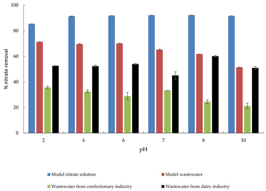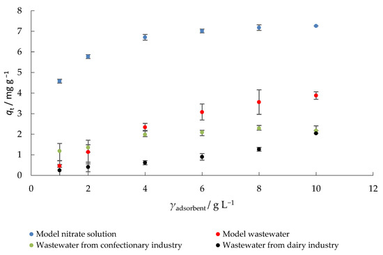 Using a model solution of nitrates, the maximum removal efficiency (percent nitrate removal) and amount of nitrate adsorbed on MHS (93%, 7.26 mg g−1) were obtained at the highest adsorbent concentration used. The highest efficiency of nitrate removal in the model wastewater was 54%, in the wastewater from confectionery industry 25%, and in the wastewater from dairy industry 27%, while the amounts of nitrate adsorbed onto MHS were 3.9, 2.2, and 2.1 mg g−1, respectively, under the same experimental conditions (10 g L−1 adsorbent concentration). When model nitrate solutions were tested, increasing the adsorbent mass had no significant effect on the percent nitrate removal. To keep operating costs as low as possible, the concentration of adsorbent chosen for further experiments was 4 g L−1. Moreover, at the adsorbent concentration of 4 g L−1, a good balance was observed between the percent nitrate removal and the amount of nitrate adsorbed onto MHS. Similar trends have been observed in other studies, e.g., Kalaruban et al. [47] reported higher nitrate removal efficiency when the concentration of the adsorbent (corncob and coconut copra modified by amine grafting) increased. Hafshejani et al. [42] also observed an increase in nitrate removal with the increase in adsorbent dosage in modified sugarcane bagasse.