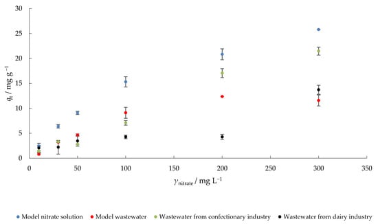 The adsorption experiments were carried out in a batch-type procedure using a shaker water bath (Bioblock Scientific, Poly-test 20). The adsorption experiments were performed in different aqueous media, namely, a model nitrate solution (MS), a model (synthetic) wastewater (MW), and two real wastewater samples—one from the confectionery industry (CW) and one from the dairy industry (DW).
