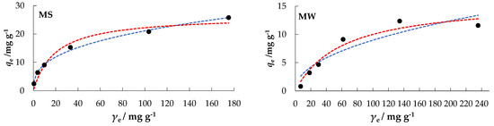 The orientation of the curves in Figure 8 indicates an “L” type, subgroup 2, for MS, MW, and DW; and a “C” type, subgroup 1, for CW, according to the isotherms classification by Giles [51], which are the classical and best-known Langmuir isotherms.