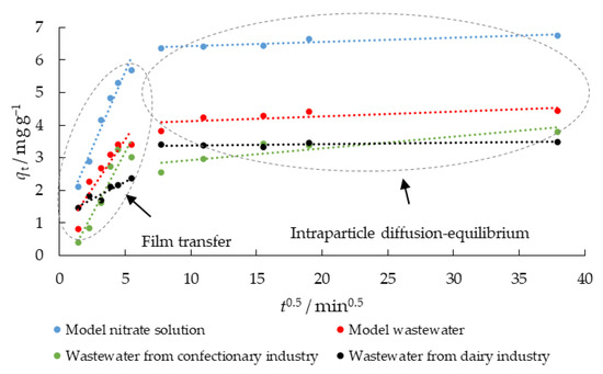 Table 6 shows that the qm exp. values are not in agreement with the calculated qm 1 values, indicating that the pseudo-first-order model is not well suited for modelling the kinetic data. The coefficient R, and the calculated qm 2 values are closer to the experimental values, suggesting that the adsorption kinetics is better described by the pseudo-second-order kinetic model and the nitrate adsorption process could be controlled by chemical adsorption. However, the q vs. ln t plot does not pass through the axis origin (data not shown); although it is linear, supporting the conclusion that the adsorption rate could be controlled by mass transport either in the liquid phase or within the particles. Therefore, to clarify the diffusion mechanism, the diffusion model of Weber and Morris was used for further analysis of the kinetic data. Two linear steps can be seen at the intraparticle diffusion model plot, indicating multilinearity (Figure 9).
