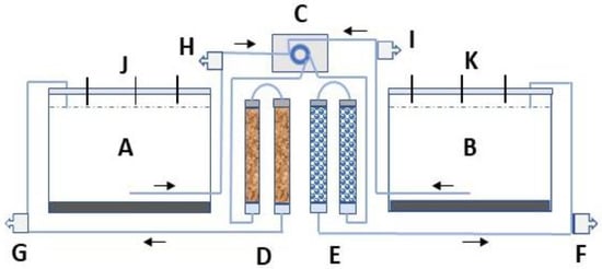 Schematic presentation (not to scale) of the experimental set-up. Hypolimnetic water was pumped (C) from container (A) to two series-connected columns (D) filled with Polonite and back to the water surface. An identical procedure was performed with container B, but the water was pumped (C) through columns filled with glass beads (E). Openings in the lid (J,K) were used for sampling of water, in situ measurements of physical parameters, and supply of N2. (F–I) indicate ports for sampling column influent water and column effluent water, respectively. The water in the containers was measured randomly at three depths: 5 cm below water surface, 15 cm below, and at 23 cm depth, just above the sediment surface. The 10 cm thick layer of sediment is marked in black.