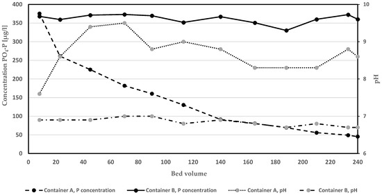 The change in pH of the column effluents, i.e., the inflow water to the containers, is shown in Figure 2. After the initial treatment of 7.5 BV, pH was very different between the treated water in Polonite and glass bead control columns, i.e., 12.1 and 6.7, respectively. After the total treatment of 240 BV, pH still was high in the Polonite effluent (pH 10.8) and almost unchanged (pH 6.8) in the glass bead effluent. The alkaline filtrate from Polonite had a great impact on the pH in container A, while no such change was observed in the container B, fed by filtrate from the glass bead column. However, pH approached a maximum of 9.5, despite the fact that 37.9 L of water was pumped in the closed circuit, i.e., 6.9 L more than was filled in the containers. The intermittent bubbling of N2 into the water did not cause the increase in pH, as revealed from the data collected in container B.