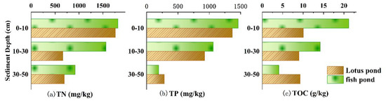 The vertical distribution characteristics of nutrients and TOC in sediments of fish pond and lotus pond were obviously different. Shown in Figure 1a, the contents of total nitrogen in surface sediment (0–10 cm) of the fish pond and the lotus pond were the highest, reaching 1810 and 1760 mg/kg, respectively. The total nitrogen content of the fish pond decreased gradually from surface to bottom, but was significantly higher than that of the lotus pond. The concentration of the middle layer of the fish pond was also high, reaching 1560 mg/kg. The TN content in the middle and bottom layers of the lotus pond was similar. As shown in Figure 1b, the contents of TP in the surface sediment of the fish pond and lotus pond were the highest, 1463 and 1370 mg/kg, respectively. The contents of total phosphorus in the fish pond and lotus pond decreased from the surface to the bottom, which was similar to the varying of total nitrogen. Figure 1c shows the variation of TOC contents in the columnar sediments. The content in the surface layer of the fish pond was as high as 21.2 g/kg, and decreased rapidly from the surface layer to the bottom layer. The TOC content in the surface layer of the lotus pond sediment was relatively high, 10.1 g/kg, and the contents in the middle and bottom layer were basically equivalent to those in the surface layer. In general, the contents of TP and superficial TN in fish pond samples were like those in the lotus pond (p > 0.05), while the contents of TN in the middle and bottom layers were higher than the values in the lotus pond. The TOC content in the surface layer of the fish pond was significantly higher than the lotus pond. TP and TOC in the bottom layer of the lotus pond were significantly higher than the fish pond.