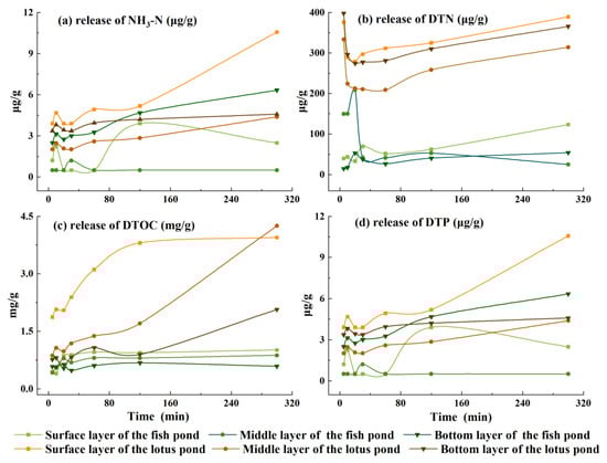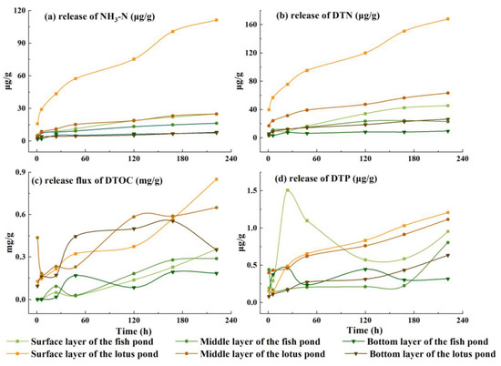 The release amounts of TOC, DTP, NH3-N and DTN in sediment samples under disturbance are shown in Figure 2. The release of TOC, DTP, NH3-N and DTN in the surface layer of the lotus pond was the highest, followed by the bottom sediments, and the release of the middle layer was the lowest. The release of TN and TOC in different layers from the fish pond was similar, and was lower than the lotus pond. In the release experiment under disturbance conditions, the surface sediments of the lotus pond had the highest release amounts of TOC, DTP, NH3-N and DTN. The release of nutrients (DTP, NH3-N and DTN) in the bottom sediment of the lotus pond was higher than that of the middle layer, while the release of TOC in the middle sediment exceeded the bottom sediment. There was a continuous release of TOC, DTP, NH3-N and TN in the sediment of the lotus pond, while the release of nutrients was only rapid at its initial stage in the fish pond. It is worth mentioning that the amounts of TOC and nutrients released from the sediments in the lotus pond were significantly higher than those in the fish pond, despite their relatively low amount.
