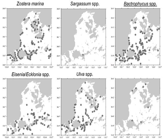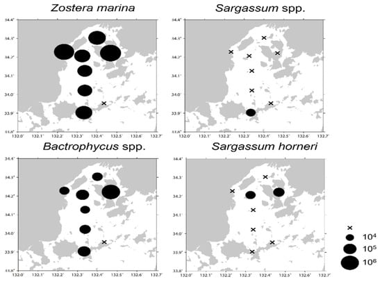 Distribution of various macrophyte taxa in Hiroshima Bay. The solid circles show each species’ observed site.
