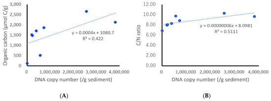 Correlation analysis between the number of copies of the eDNA of Zostera marina and the amount of organic carbon (A) and the C/N ratio (B) in marine sediment samples from Hiroshima Bay.
