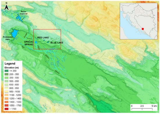 Red Lake is located near the town of Imotski (Croatia) in the central part of the Dinaric Karst, or more precisely, in the northeastern higher part of Imotsko Polje (Figure 1). Imotsko polje is an example of polje in karst, defined by Bonacci as “depressions in the limestone karst, generally elliptical with relatively gently sloping bottoms from the spring zone to the swallowhole zone” []. The best-known phenomena are the Blue and Red Lakes, although there are up to 18 similar karst forms in the same area, dry or permanently filled with water []. The most important spring is Opačac, which serves as a water supply of the Imotski region.