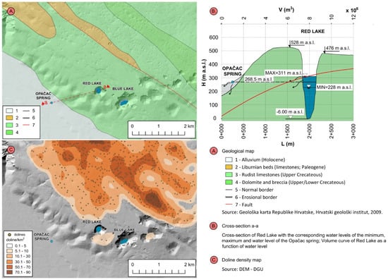 Geological map of the study area (A), the cross-section a-a combined with the volume curve of Red Lake as a function of water level (B) and doline density map (C).