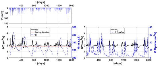 Comparison of precipitation at the Imotski gauging station with Red Lake integral volume changes (IVC), related water levels (H), and Opačac Spring discharges.