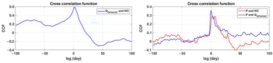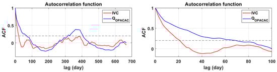 The correlation analysis was used to determine the autocorrelation function for integral volume changes in Red Lake and discharges at Opačac Spring, as well as the cross-correlation function between these two data and the cross-correlation function of precipitation with integral volumes and discharges in Opačac. The autocorrelation function can be used to quantify the memory effect of the system, which is measured by the time delay at which the autocorrelation function reaches 0.2 [,]. The memory effect shows how water is stored, namely by filling and emptying subsurface reserves. Figure 6 depicts the 21-day memory effect for Red Lake and the 69-day memory effect for Opačac Spring. As a result, the Opačac hydrogeological system is far more inert than the Red Lake system, where water retention in the karst network is significantly shorter than at Opačac.