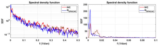 where Cxy and Cyx are covariances and σx and σy are the standard deviations of the two observed series [,,]. Spectral analysis, unlike correlation analysis, analyses signals in the frequency domain. Therefore, the spectral density function represents a Fourier transform of the autocorrelation function. Both functions describe a stationary stochastic process containing the same information but in a different domain. The identification of periodic phenomena, expressed in terms of the detection of different peaks, is defined by the spectral density function as follows [,]: