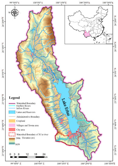 Location and map of Lake Erhai watershed, the two outflows are marked with light blue. The Xi’er river watershed in the southeast of the lake is circled with red dotted line, the natural runoff in this area do not flow into the lake.