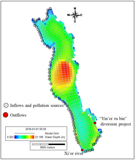 The boundary conditions are the external driving forces of the model. The boundary conditions include the flow rates, water temperature and concentrations of water quality parameters within the inflow tributaries. The flow rates and water quality variables were monitored monthly by the local government of the Ecological and Environmental Bureau of Dali Bai Autonomous Prefecture for major rivers and streams. The boundary conditions were established using these data.