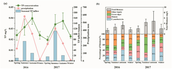 Seasonal variation of phosphorus concentration, phosphorus inflow and main algal groups in 2016–2017: (a) the seasonal average phosphorus concentration, total phosphorus load and precipitation; (b) the variation of total biomass and composition of algal groups.