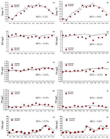 Calibration of water quality in Lake Erhai: (a–e) temp/DO/TN/TP/Chla in Southern lake center; (f–j) temp/DO/TN/TP/Chla in northern lake center.