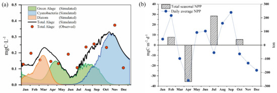 Simulated total biomass of phytoplankton and net primary production in Lake Erhai: (a) the simulation of phytoplankton biomass in Lake Erhai; (b) phytoplankton net primary production in Lake Erhai in each month and season of 2017. The daily average NPP of every month and total seasonal net primary production (including basal metabolism, grazing and settling, in ton) is represented by a dark blue dot and column, respectively.