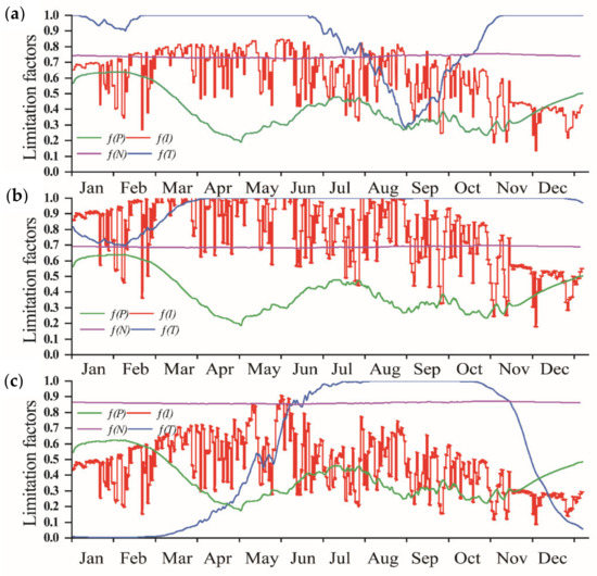 Time variation of phytoplankton communities and limitation factors of 3 algal groups in Lake Erhai; (a) Diatom; (b) Green Algae; (c) Cyanobacteria; (T), ƒ(I), ƒ(N) and ƒ(P) represent water temperature, irradiation, nitrogen and phosphorus limitation, respectively.
