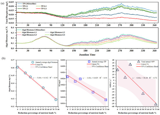(a) Time plot of average algal biomass concentration and TP concentration in Lake Erhai under different reduction scenarios; (b) load reduction curve for average algal biomass, average TP concentration and annual NPP.