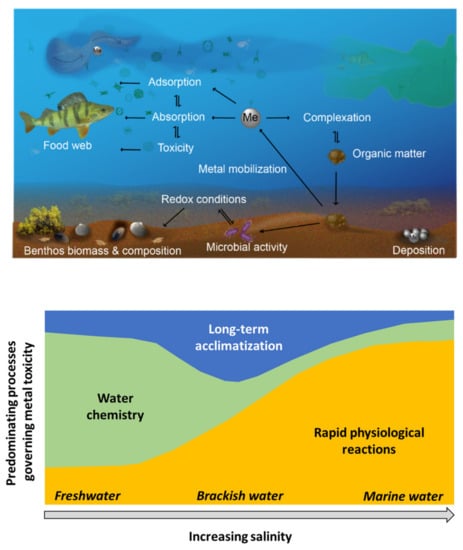 Schematic illustrations of selected processes influencing and governing metal toxicity in the aquatic and sediment compartments influenced by water salinity, adapted from ref. [8].